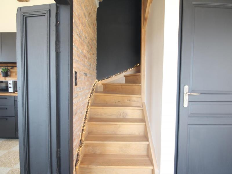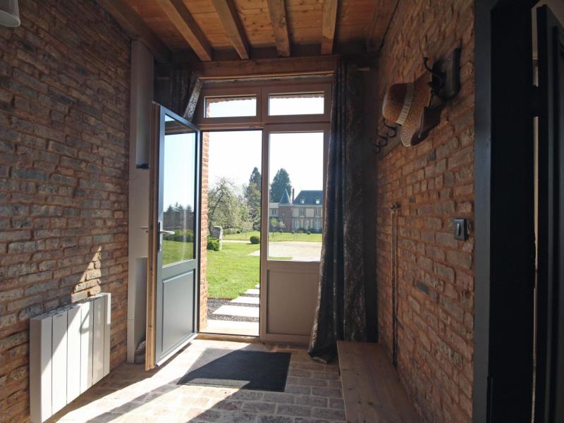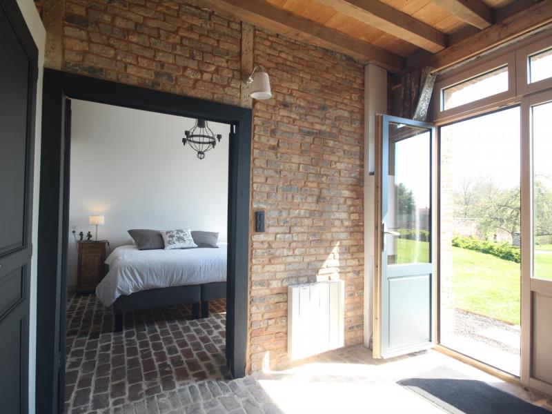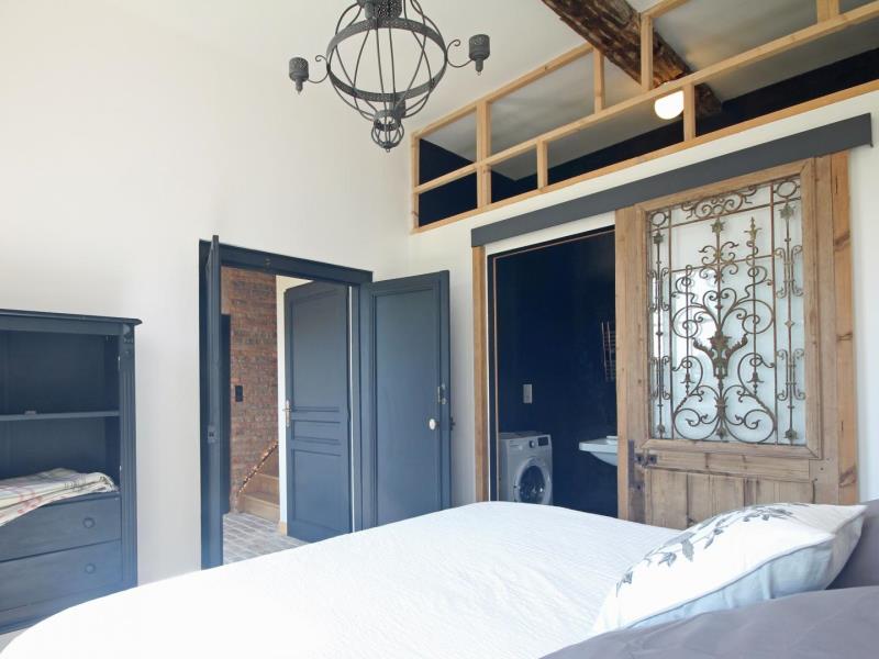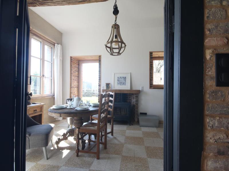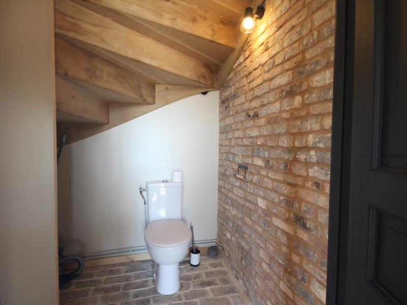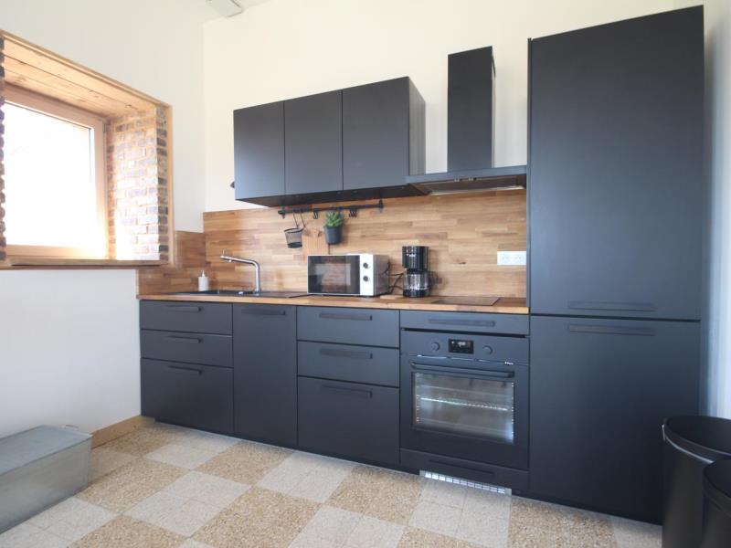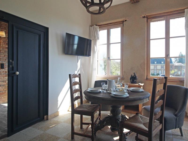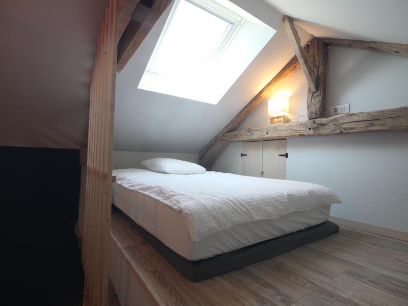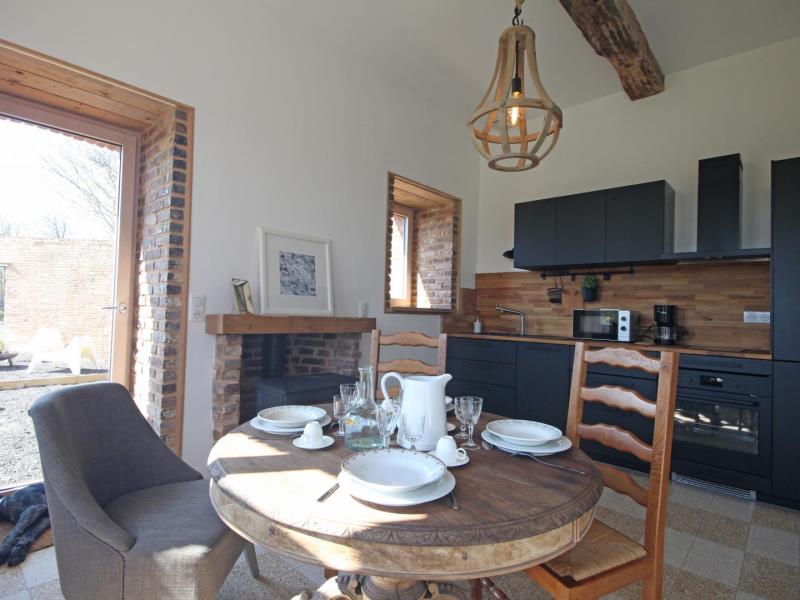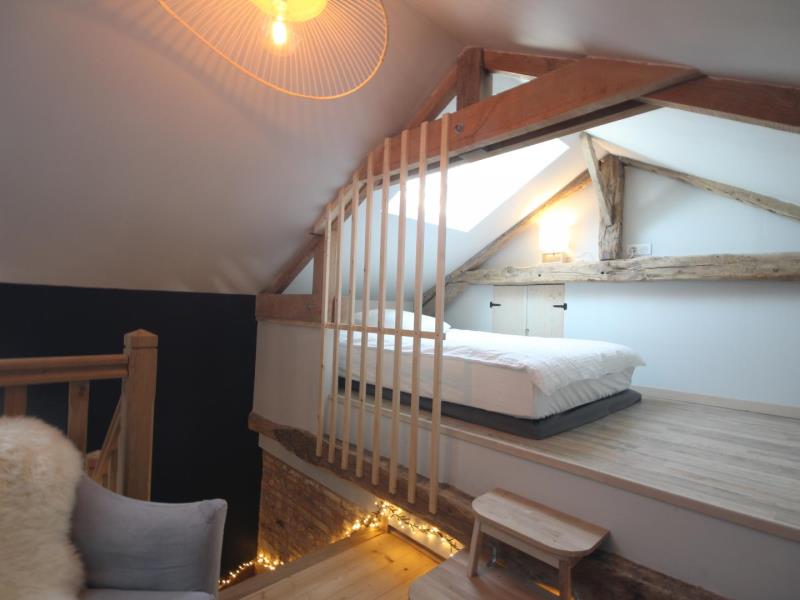 Rez-de-chaussée : – entrée, – séjour/cuisine (plaque à induction 2 feux, réfrigérateur avec partie congélateur 2 tiroirs, lave-vaisselle 6 couverts, micro-ondes, four), espace repas, TV, poêle à bois. – accès à la terrasse avec salon de jardin en teck, barbecue et brasero, – wc (sous escalier), – chambre : 2 lits 90x200cm pouvant être réunis en 1 lit 180cm, avec salle d’eau : lavabo, douche italienne, lave-linge, Lit bébé et chaise haute sur demande. A l’étage en mezzanine mansardée : – accessible par 2 marches : 2 lits 140x200cm, – petit espace détente avec canapé 2 places, Extérieur : – Parc arboré non clos, grand parking. Animal accepté : 1 seul chien par séjour (pas de chat).