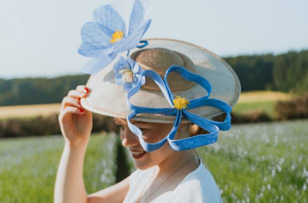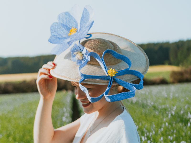 Fidèle au territoire, Brigitte Varnier tisse un lien tout particulier avec le lin, cette fibre noble emblématique du Pays de Caux, reconnaissable à sa petite fleur bleue qui colore les champs au printemps. Brigitte Varnier en sublime la texture et la légèreté, donnant naissance à des créations élégantes et contemporaines. Elle a notamment signé de magnifiques chapeaux pour le Festival du Lin et de l’aiguille, véritables hommages au savoir-faire local.